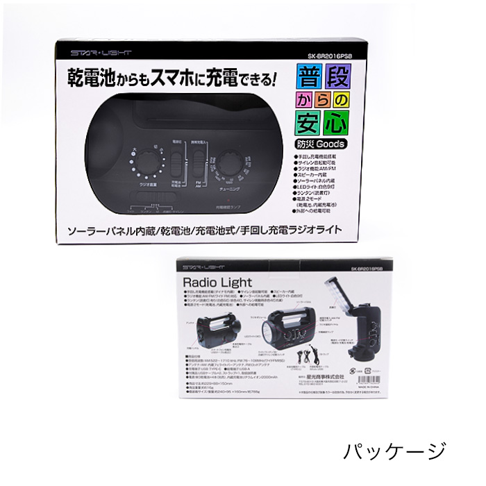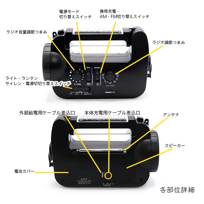 品名:ソーラーパネル内蔵/乾電池式/充電池式/手回し充電ラジオライト
