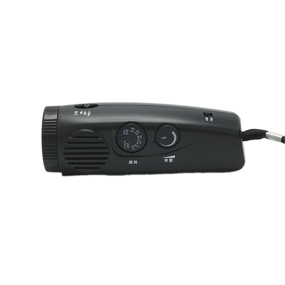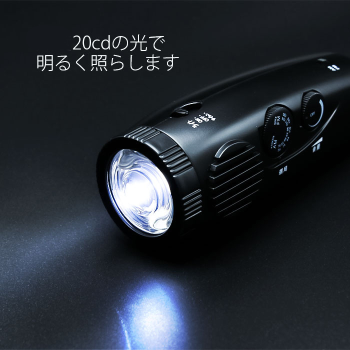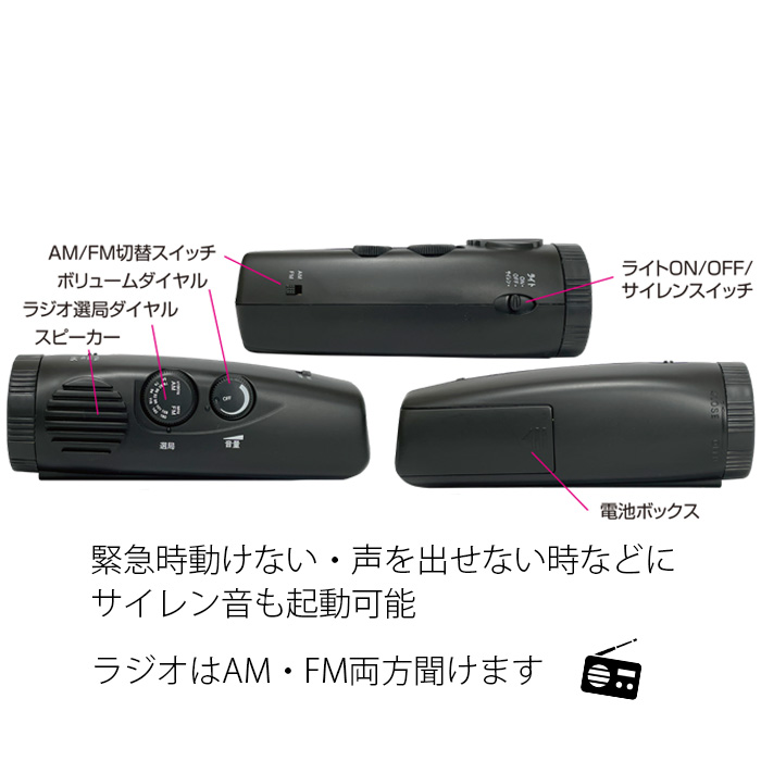 LEDライト、サイレン、AM/FMラジオ機能、アンテナ兼用ストラップ付。