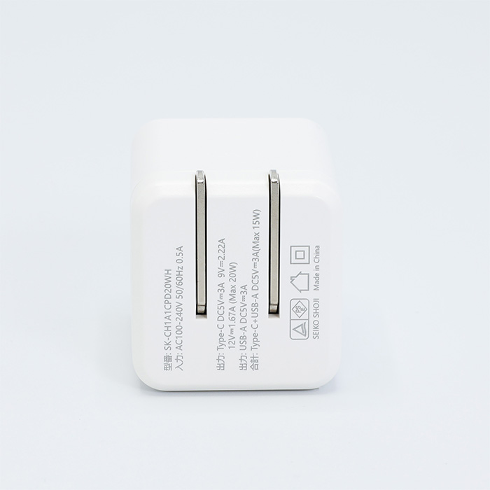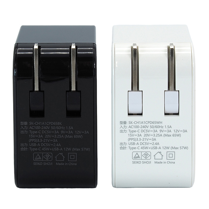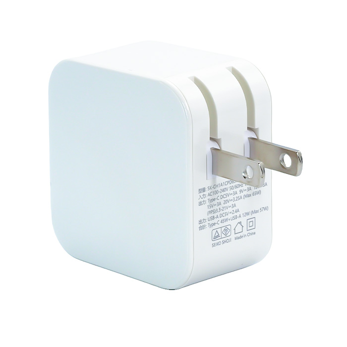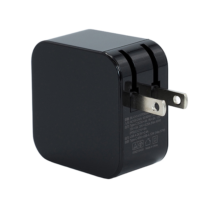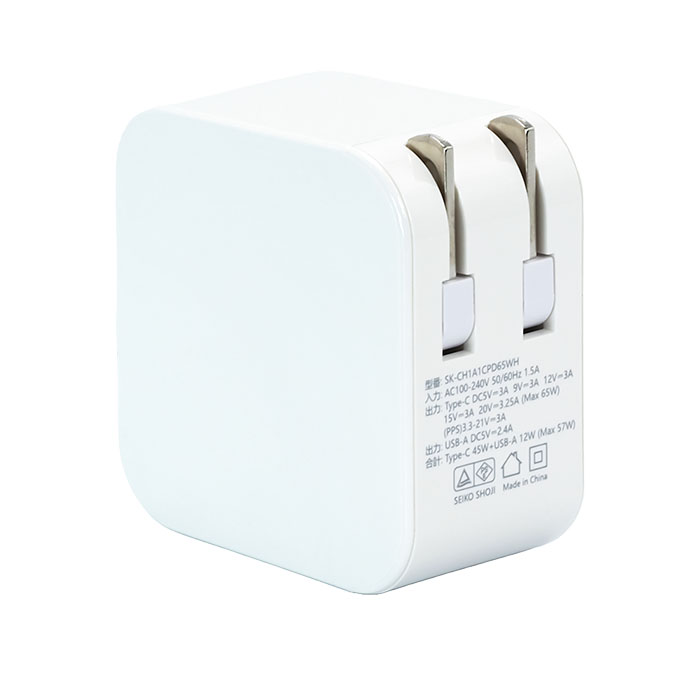 | 出力 | USB-A: DC5V / 2.4A Type-C DC5V 3A、9V 3A、12V 3A、15V 3A 20V 3.25A(最大65W) PPS: DC3.3V~21V 3A ※ Type-AとUSB-A同時使用時は最大Type-C 45W + USB-A 12W (合計57W)まで |